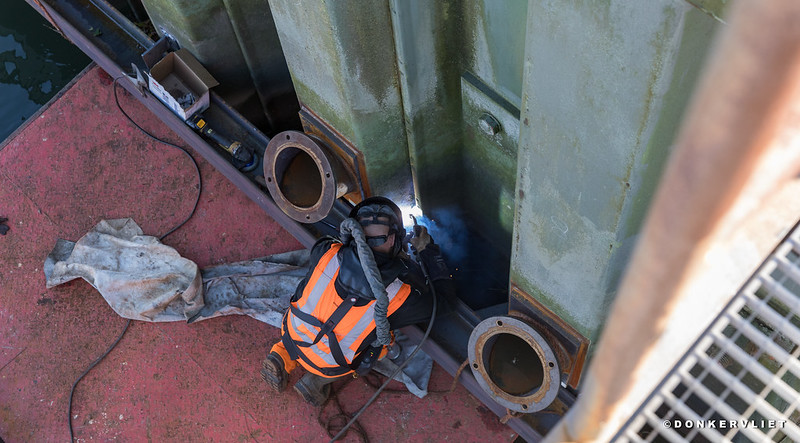 Ook deze week is er weer hard gewerkt aan de voorbereidingen voor het aanbrengen van groutankers, die onderdeel uitmaken van de damwandverbetering van de damwand langs het EMK terrein. Bij laag water is aan de zijde van de Hollandsche IJssel een verstevigende gording (metalen H-balk) vastgelast op de damwand. Daarnaast zijn inmiddels 45 van de 182 ankerstoelen op de damwand gelast om straks hierdoor de groutankers door de damwand in de grond te kunnen boren.